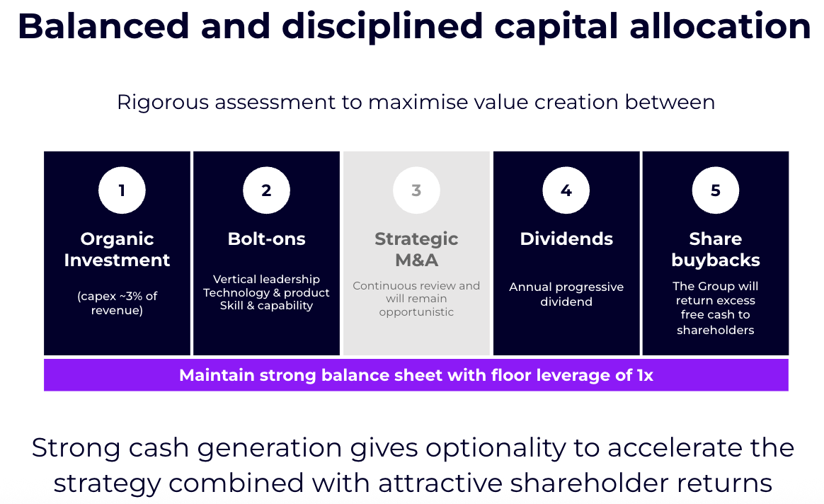 - Our primary focus is on organic growth as a priority, re-investing into the business with capex planned at ~3% of revenue. Where appropriate, we then leverage our strong cash flows to create value through M&A.